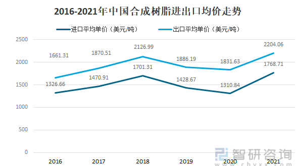 合成树脂工业在国产化催化剂、工艺及装备开发等方面取得令人瞩目的成就。和国外先进水平相比,我国合成树脂工业仍存在一定差距。2021年合成树脂进口平均单价为1768.71美元/吨;合成树脂出口平均单价为2204.06美元/吨。