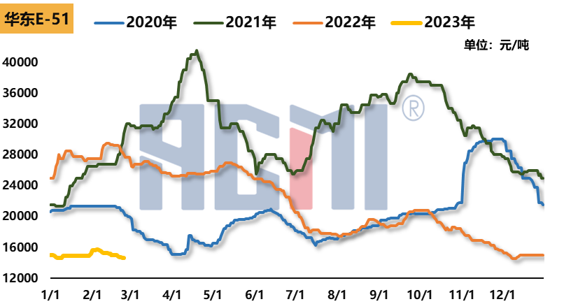 价格方面:上周国内环氧树脂市场继续走跌:截至2月24日,华东液体环氧树脂参考价14600元/吨,较前一周下跌400元/吨;固体环氧树脂参考价14000元/吨,较前一周下跌300元/吨。