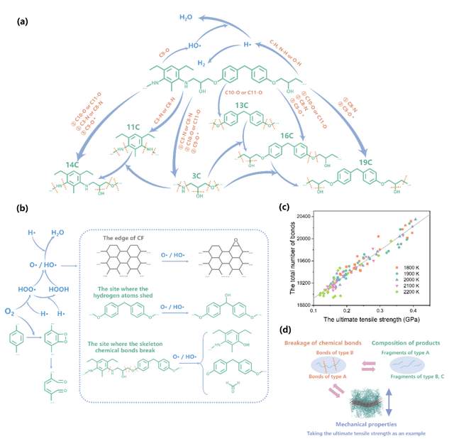 近期,清华大学卢滇楠教授、杨睿教授团队以ReaxFF MD模拟为主,以传统MD模拟和机器学习方法为辅,研究了碳纤维/环氧树脂复合材料的热氧老化机制。在该工作中,树脂基体所受拉伸应力与其内部热氧老化反应之间的可解耦性首先得到验证。随后,碳纤维/环氧树脂复合材料对拉伸应力响应的各向异性得到验证,即:平行于纤维方向的抗拉强度(图1)远高于垂直于纤维方向,其拉伸应力主要来自于纤维的拉伸,在极限情况下,纤维—树脂界面将发生滑脱。首次分析了材料与界面相关的老化反应特性,纤维—树脂界面结合相互作用限制了靠近界面处树脂原子的热迁移能力,从而降低了界面相区域中树脂的老化反应事件发生概率,限制其老化程度(图2)。重构了老化反应机理研究方法,由对化学反应的识别转变为对化学键的识别,揭示了树脂网络骨架中羟基、醚键和 C-N 键的高断裂概率(图3),与前人实验结论相符。结合轨迹跟踪和数据分析可知,这些高断裂概率化学键的断裂,与主产物的生成密切相关(图4a),可基于体系的化学键信息,实现对老化产物分布(图5)、老化产物断键机理(图6)的高效预测。同时,体系化学键总数目与材料垂直于纤维方向的极限抗拉强度(薄弱环节)呈线性相关(图4c)。通过构建“产物—化学键—力学性能”之间的紧密关联(图4d),可揭示碳纤维/环氧树脂复合材料的热氧老化全景,为后续新型寿命预测模型的开发奠定理论基础。该工作以“Panoramic View of Interface-Related Thermo-oxidative Aging of Carbon Fiber-Reinforced Epoxy Composites”为题发表在《Macromolecules》上(DOI: