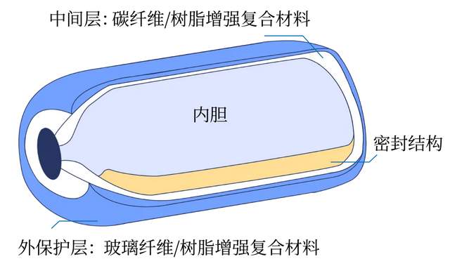Ⅲ型和Ⅳ型高压储氢气瓶内部结构精妙,主要由内胆、中间层、外保护层及密封结构组成。中间层通常采用碳纤维和树脂增强复合材料,外保护层则采用玻璃纤维和树脂增强复合材料。