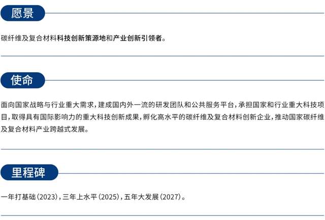 创新中心聚焦于以碳纤维为增强材料的复合材料及其在航空航天、土木工程结构、关键装备、清洁能源、双碳与可持续发展等事关国家安全与国计民生的战略领域,重点攻克先进碳纤维、高性能与多功能复合材料、装备轻量化、异质材料连接、全寿命周期评价与循环应用等关键技术,解决我国现阶段在碳纤维及复合材料技术领域的“卡脖子”技术难题,支撑区域和国家的安全装备自主保障和循环经济可持续发展,为行业发展提供源头技术供给,支撑产业向中高端迈进。中心的愿景是成为碳纤维及复合材料科技创新策源地和产业创新的引领者,并通过资源整合和开放创新,建设发展成为国家碳纤维及复合材料技术创新中心。