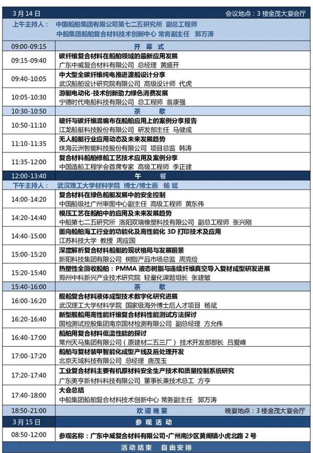 会议以“科技赋能产业链 创新助力碳中和”为主题,围绕中国船舶产业链发展、创新服务及相关规范标准研究,船艇电动化-技术创新发展,船艇装备制造工艺等议题进行深入探讨,深度聚焦复合材料在船舶设计与制造中的智能化、高效化和环保化发展,探讨如何采用数字化、规模化的生产制造工艺,提升船舶制造业的技术水平和建造品质,共同推动智能航运技术创新,促进船舶产业的绿色低碳转型。会议期间安排参观广东中威复合材料有限公司的真空灌注车间(主要是船体成型车间,讲解40米级碳纤维船体一次性真空成型)、舾装车间(主要进行船体的拼装和整船的舾装建造,还有碳纤维平板的制造)以及参观亚洲最大的的40米级全碳纤维纯电渡轮 ,提问交流,探讨相关工艺技术问题。诚邀国内外船舶行业专家、各大船厂代表、学者、和行业同仁莅临大会,共谋复材新未来!