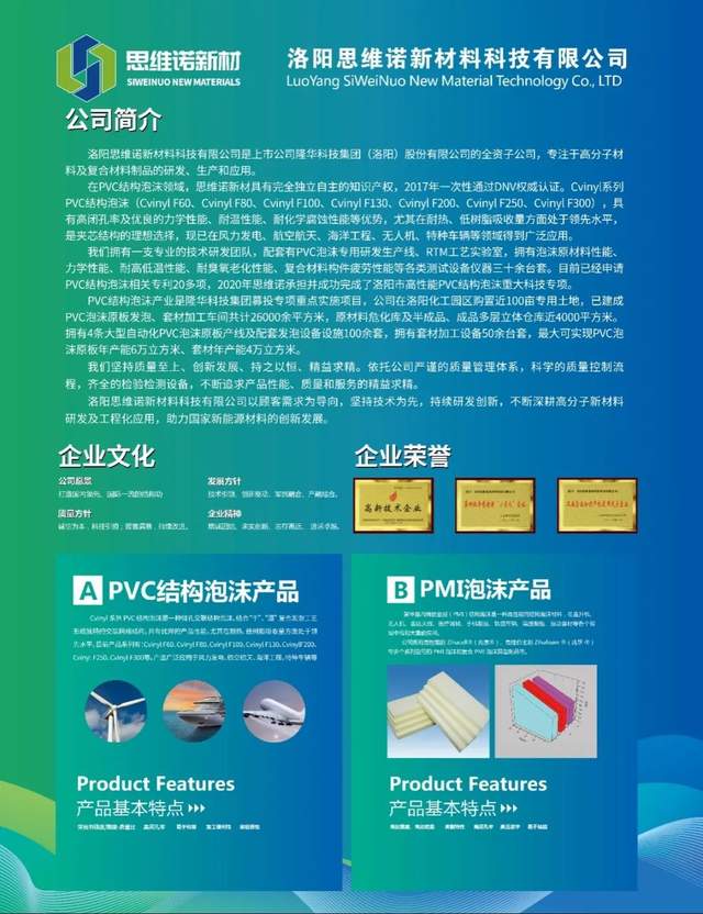 洛阳思维诺新材料科技有限公司是上市公司隆华科技集团(洛阳)股份有限公司的全资子公司,专注于高分子材料及复合材料制品的研发、生产和应用。在PVC结构泡沫领域,思维诺新材具有完全独立自主的知识产权,2017年一次性通过DNV权威认证。Cvinyl 系列PVC结构泡沫(Cvinyl F60、Cvinyl F80、Cvinyl F100、Cvinyl F130、Cvinyl F200、Cvinyl F250、Cvinyl F300),具有高闭孔率及优良的力学性能、耐温性能、耐化学腐蚀性能等优势,尤其在耐热、低树脂吸收量方面处于领先水平,是夹芯结构的理想选择,现已在风力发电、航空航天、海洋工程、无人机、特种车辆等领域得到广泛应用。我们拥有一支专业的技术研发团队,配套有PVC泡沫专用研发生产线、RTM工艺实验室,拥有泡沫原材料性能、力学性能、耐高低温性能、耐臭氧老化性能、复合材料构件疲劳性能等各类测试设备仪器三十余台套。目前已经申请PVC结构泡沫相关专利20多项,2020年思维诺承担并成功完成了洛阳市高性能PVC结构泡沫重大科技专项。PVC结构泡沫产业是隆华科技集团募投专项重点实施项目,公司在洛阳化工园区购置近100亩专用土地,已建成PVC泡沫原板发泡、套材加工车间共计26000余平方米,原材料危化库及半成品、成品多层立体仓库近4000平方米。拥有4条大型自动化PVC泡沫原板产线及配套发泡设备设施100余套,拥有套材加工设备50余台套,最大可实现PVC泡沫原板年产能6万立方米、套材年产能4万立方米。我们坚持质量至上、专业专注、持之以恒、精益求精。依托公司严谨的质量管理体系,科学的质量控制流程,齐全的检验检测设备,不断追求产品性能、质量和服务的精益求精。洛阳思维诺新材料科技有限公司以顾客需求为导向,坚持技术为先,持续研发创新,不断深耕高分子新材料研发及工程化应用,助力国家新能源材料的创新发展。
