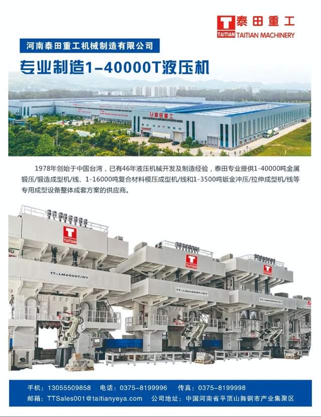 河南泰田重工机械制造有限公司成立于2017年,1978年创始于中国台湾,1998年组建于厦门,已有46年液压机械开发及制造经验。泰田专业提供1-40000吨金属锻压/锻造成型机/线、1-16000吨复合材料模压成型机/线和1-3500吨钣金冲压/拉伸成型机/线等专用成型设备整体成套方案的供应商。泰田一直以来为国内外客户供应高精密、高品质、高性价比中/大型液压成型机及整体成型线方案著称,在国内外业界建立了良好的口碑与信用。公司经过多年的快速发展,参与并完成了一项国家标准制定工作;获取各项专利 50 余项,获批河南省企业技术中心、河南省液压智能装备工程技术研究中心、河南省复合材料用高效节能液压成型装备工程研究中心、河南省技术转移示范机构、河南省工业设计中心等多个省级研发平台;荣获得河南省瞪羚企业、河南省专精特新企业、河南省智能车间、河南省优秀智能应用场景、河南省创业领军人才等荣誉。2021-2023年连续三年产品被认定为河南省首台套重大技术装备。公司占地10万余平方面积,具备单个框架300吨生产加工能力,具有大中型数控加工中心13台,大型热处理炉、大型无尘装配中心和涂装中心等先进设备,形成年产300台套大型液压装备的生产制造能力。公司主要产品细分13个系列,为众多行 业提供关键设备和先进技术支持,提供重大装备国产化保障,产品广泛用于航空航天、船舶工业、汽车制造、轨道交通、工程机械、军事装备、电子电气、家用电器、模具制造等领域。公司已经为河钢舞钢、DANFOSS、比亚迪汽车、现代汽车、小鹏汽车、 中国电建。PERSICO、 中国兵器工业集团、海尔、海信、三一重工、中联重科、宁德时代等国内外知名企业提供技术设备和服务,并已出口全球 100 多个国家和地区。泰田以市场需求为最终导向,以高端成形机床行业向“自动化、集成化、智能化、绿色化”为重要突破口,强化行业细分领域优势,不断推动产品迭代升级。依托高端装备制造能力和经验,坚持新材料、制造工艺和核心技术的研究,推动高端制造产业的发展。