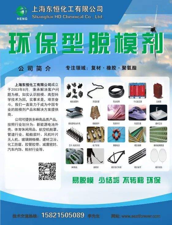 上海东恒化工有限公司成立于2003年,聚焦脱模剂产品的自主研发、生产和销售。秉承解决客户问题为根,如实认识脱模、离型科学技术为因,实事求是艰苦奋斗,我们一直致力于成为中国专业的脱模剂产品和解决方案提供商。2013年,在成都设立成都东恒新材料科技有限公司,新增产线,扩大生产供货能力。2017年,在江西设立江西东恒新材料有限公司,进一步扩大生产供货能力。我们可提供多种高品质产品,按照脱模剂应用行业大类有:复材行业、橡胶行业、聚氨酯行业。按照脱模剂应用领域细分有:橡胶领域:橡胶胶管、橡胶减震密封、橡胶机带类、轮胎力车胎类、胶布制品、橡胶胶带、橡胶胶塞、橡胶胶辊、橡胶绝缘制品、橡胶胶乳制品、各种橡胶型材。复材领域:新能源汽车电池外壳、航空机舱望、风力发电、无人机、船舶桨叶、轨道交通、运动休闲、建材卫浴、电子电力、电气设备、玻璃钢格栅、化工防腐。聚氨酯领域:汽车滤清器、汽车顶棚、汽车座椅、汽车地毯、汽车隔音垫、汽车方向盘、PHC盖板、PU垫片、微孔弹性体、高回弹慢回弹、鞋材类、家具类、玩具类。
