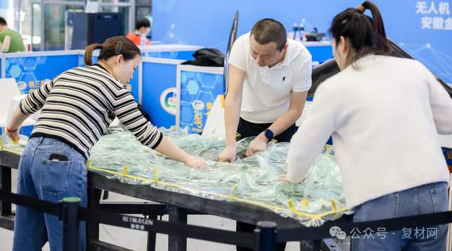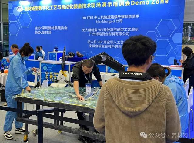 安徽金骏复合材料有限公司团队进行复合材料无人机制作演示。无人机制作运用的是真空导入工艺。真空导入工艺在模具上铺增强材料、夹心材料等,然后铺真空袋,并抽出体系中的空气,在模具型腔中形成一个负压,利用真空产生的压力把树脂通过预铺的管路压入纤维层中,让树脂浸润增强材料最后充满整个模具,制品固化后,去除真空袋等辅助材料,从模具上得到所需的制品。该工艺广泛应用在汽车、飞行器、船舶、轨道交通等领域。