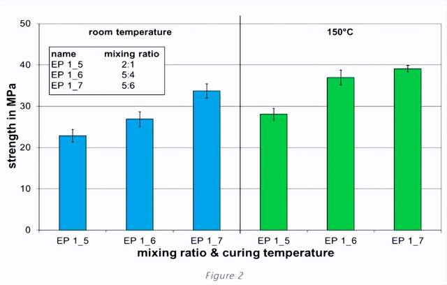 如图(2)所示,环氧树脂胶粘剂对于铜和不锈钢这两种金属材料具有有效的粘结。通过改变混合比例和高温固化,均可提高粘结强度,最高的粘结强度甚至可以提高两倍。
