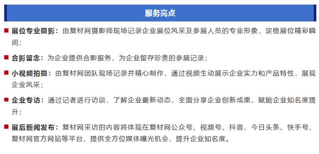 复材网深耕复合材料行业 23年,本届中国国际复材展期间,将继续承接企业专访工作。我们拥有专业拍摄团队,可根据企业需求与品牌定位,定制包含产品展示、趋势分析、技术讲解的专属采访方案,确保内容与企业形象高度契合。