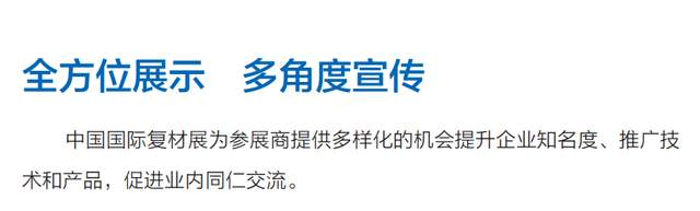 新时代背景下,展会将持续提升线下服务,开拓线上渠道,在夯实国内 基础的同时积极开拓国际市场,与全体行业同仁及合作伙伴一道,共创复合材 料行业美好的明天!