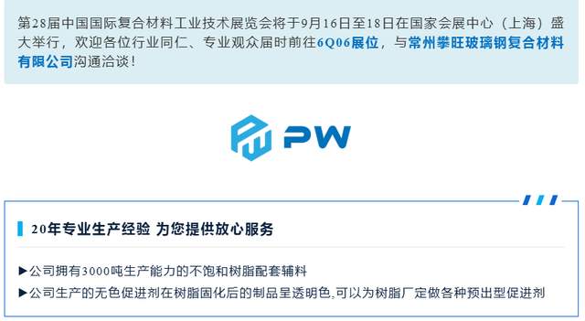 第28届中国国际复合材料工业技术展览会将于9月16日至18日在国家会展中心(上海)盛大举行,欢迎各位行业同仁、专业观众届时前往6Q06展位,与常州攀旺玻璃钢复合材料有限公司沟通洽谈!