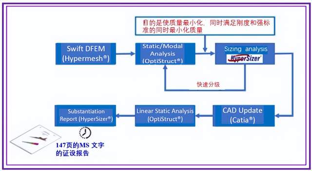 “我们的时间表非常特殊,”他继续说道。“但我知道我们可以用HyperSizer来实现这一点,HyperSizer是当时Collier套件中的一种产品的名称。我们会采用他们的有限元(FE- finite element )模型,并在其上放置我们的特定机头配置。然后我们会运行所有负载情况,并挖掘关键负载情况的数据,完善我们的模型,然后运行HyperFEA,它将您的最终分析结果输入HyperSizer以重建模型卡。然后我们重新运行FEA并继续这样做,直到我们达到所需的最小质量安全裕度。我知道该软件还将生成所需的最终认证级别报告。这是我们按时完成的唯一方法。然而,拉动结构之外的质量将完全是另一回事。”