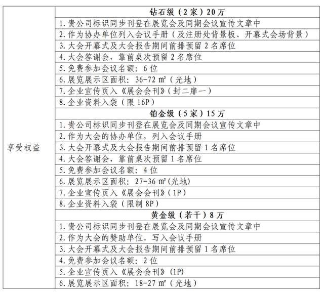 标准展位:9㎡,10000元/个。含场地、会刊介绍、现场服务。