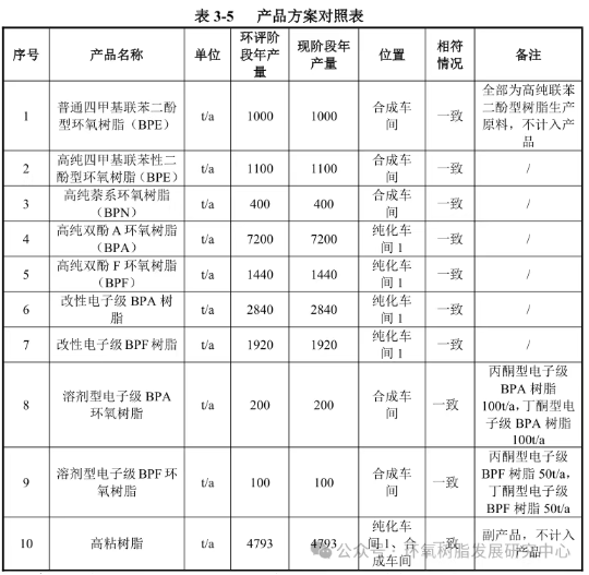 备注:改性电子级 BPA 树脂 160t 用于溶剂型电子级 BPA 环氧树脂;改性电子级 BPF 树脂 80t 用于溶剂型电子级 BPF 环氧树脂;不再列入产品方案