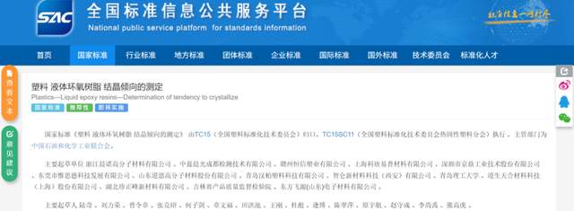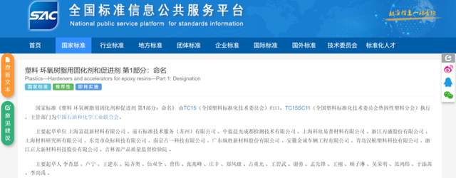 《塑料 环氧树脂用固化剂和促进剂 第1部分:命名》由上海富晨新材料有限公司为第一起草单位,联合中蓝晨光成都检测技术有限公司、上海科欣易普材料有限公司等单位共同完成;《塑料 液体环氧树脂 结晶倾向的测定》由浙江晨诺高分子材料有限公司主导,联合中蓝晨光成都检测技术有限公司、上海科欣易普材料有限公司等单位参与起草。