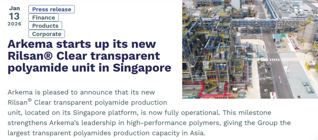 1月13日,阿科玛宣布其位于新加坡的全新Rilsan® Clear透明聚酰胺生产装置已全面投产,凭借最新产能,阿科玛一跃成为亚洲最大的透明聚酰胺供应商,与此同时,该集团的相关产能翻了三倍。