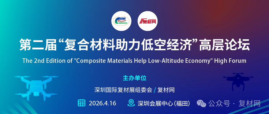 第四届深圳国际复合材料工业技术展览会将于2026年4月15-17日在深圳会展中心(福田)盛大举办。本届展会预计将汇集超过200家行业知名企业参展,吸引近10,000名全球专业观众到场交流。作为展会重磅同期活动,组委会将携手行业知名媒体“复材网”,于4月16日举办第二届“复合材料助力低空经济”高层论坛。本届论坛的主题是“复合材料低成本制造如何支撑规模化发展”,将重点探讨产业规模化发展的核心瓶颈,旨在推动材料端与应用端的协同创新与降本突破。论坛后将组织参观哈瓦国际航空产业园,实地探访国家级高新技术企业的特种装备无人机研发与制造基地,见证航天级碳纤维等复合材料在低空装备的创新应用。